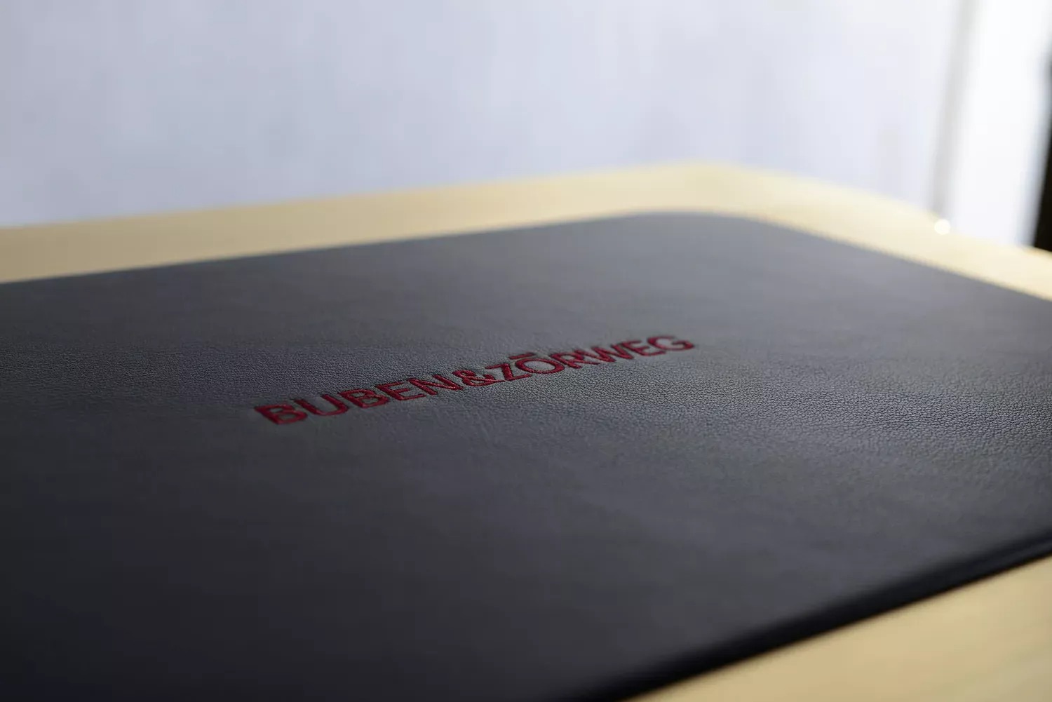 • Крышка из полированной нержавеющей стали с кожаной вставкой и инициалами BUBEN&ZORWEG